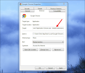 στον Chrome: κάντε δεξί κλικ στο εικονίδιο της συντόμευσης του Chrome (βλέπε εικ.) και επιλέξτε Ιδιότητες. Στην καρτέλα Συντόμευση, προσθέστε στο τέλος του πεδίου Target τη φράση "--no-extensions" (με δύο παύλες στην αρχή) και πατήστε ΟΚ. Κλείστε όλα τα ανοικτά παράθυρα του chrome και ξεκινήστε τον ξανά. Για να απενεργοποιήσετε την ασφαλή λειτουργία του Chrome, επεξεργαστείτε ξανά το εικονίδιο της συντόμευσης.